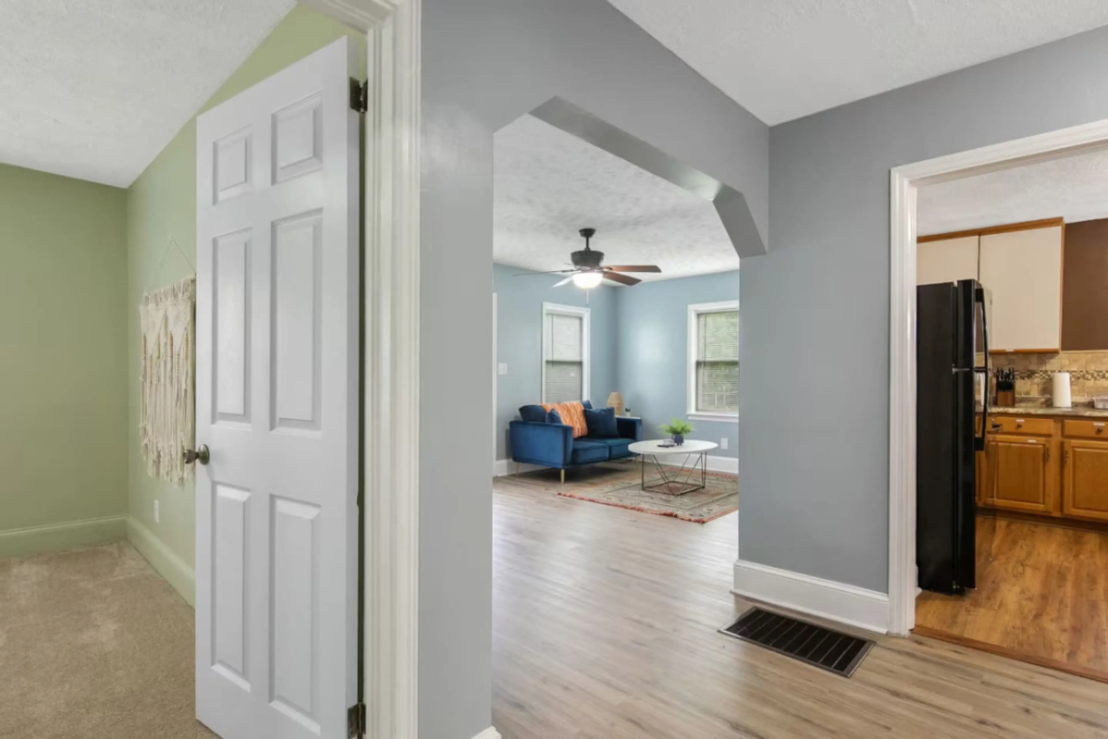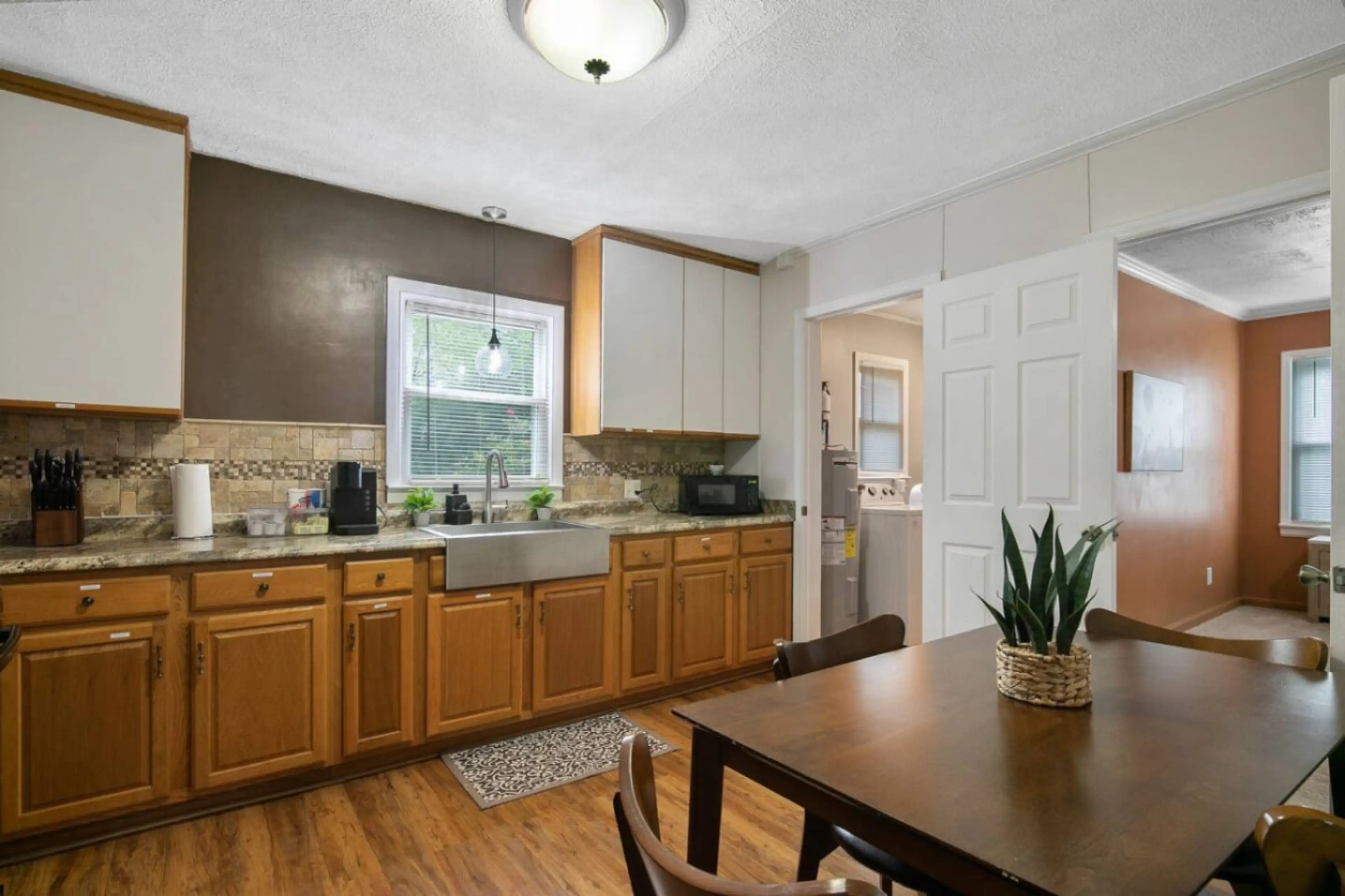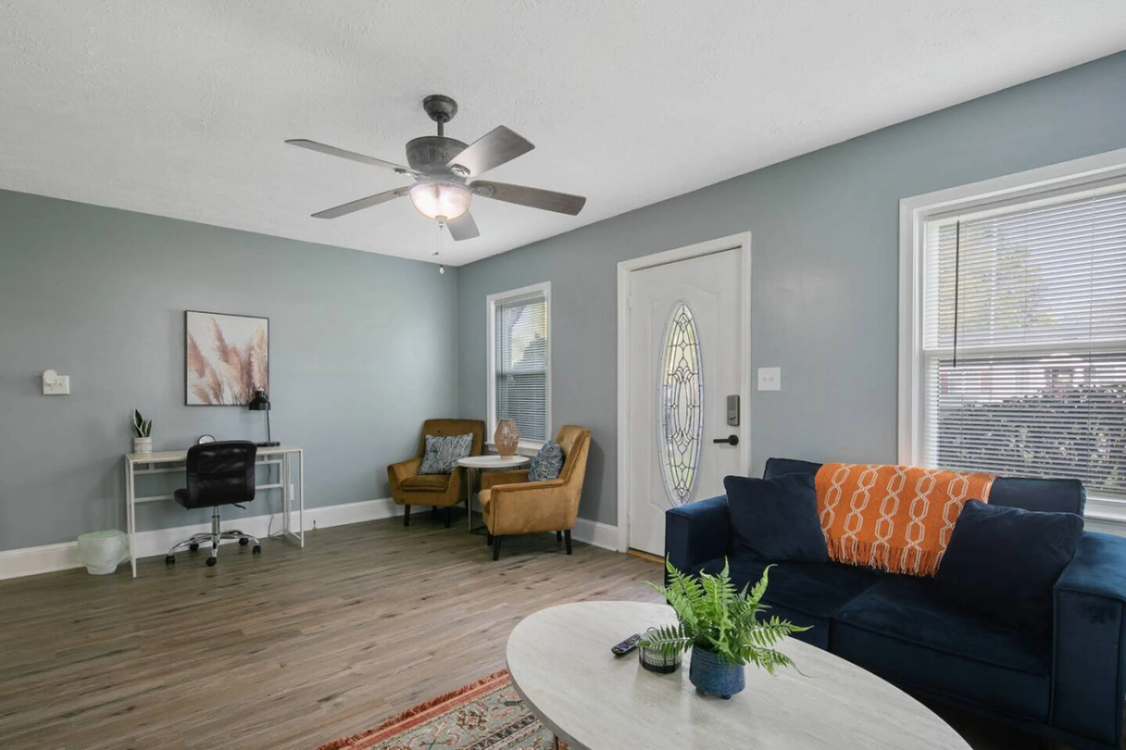 This renovated home offers a comfortable stay with modern amenities in a value-priced area of Fayetteville. The bohemian-styled interior features hardwood floors, a royal blue velvet sofa, and beach accents that create a welcoming atmosphere. While the surrounding neighborhood is in transition (you...